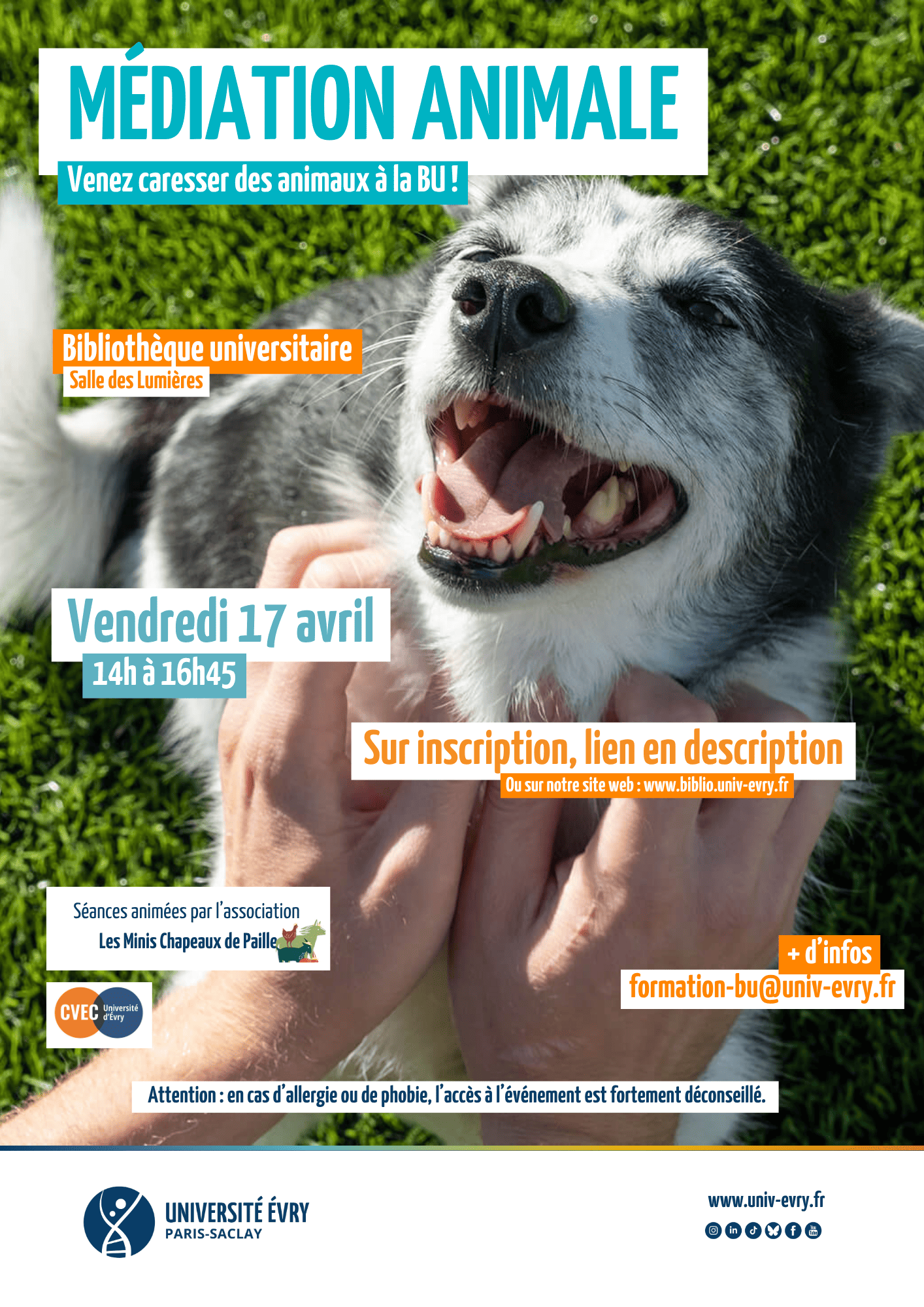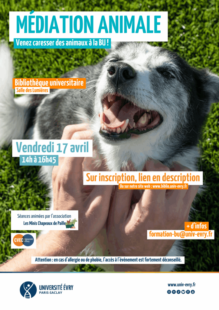 La bibliothèque universitaire propose aux étudiantes et étudiants une session de découverte à la médiation animale ! Cette activité vous propose d’interagir avec des animaux dans un cadre apaisant, favorisant le bien-être et la détente.